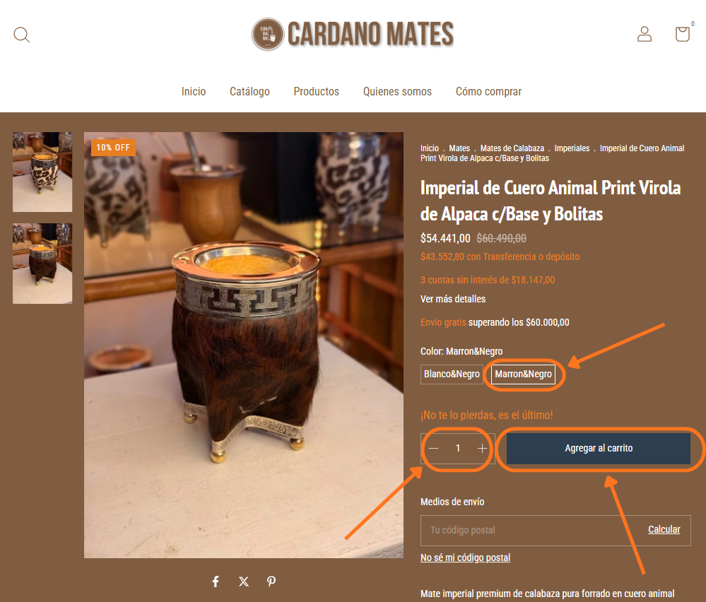 2. Elegí el modelo/color que más te guste, la cantidad que quieras y clickeá en "Agregar al carrito". Recordá que podés seguir navegando y agregar ¡todos los productos que quieras!: