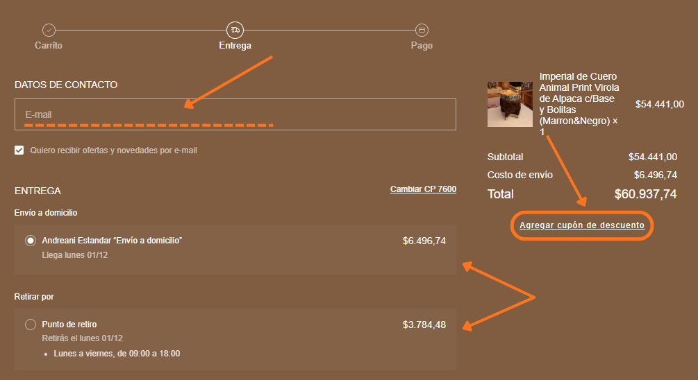 6. Completá con tu dirección de e-mail y confirmá la forma de envío que prefieras. Si tenés un cupón de descuento ¡no te olvides de agregarlo!: