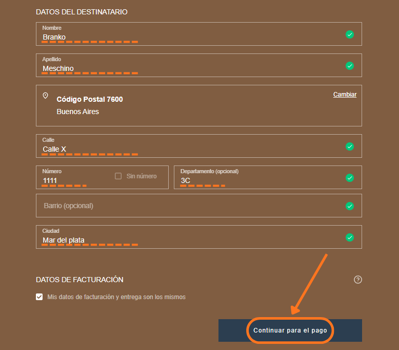 7. A continuación completá tus datos de entrega y luego clickeá en "Continuar para el pago":