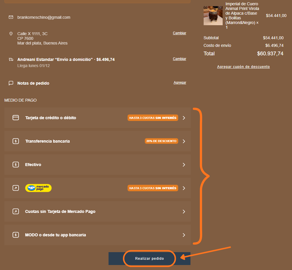8. Finalmente elegí el medio de pago que más te convenga y luego clickeá en "Realizar pedido":